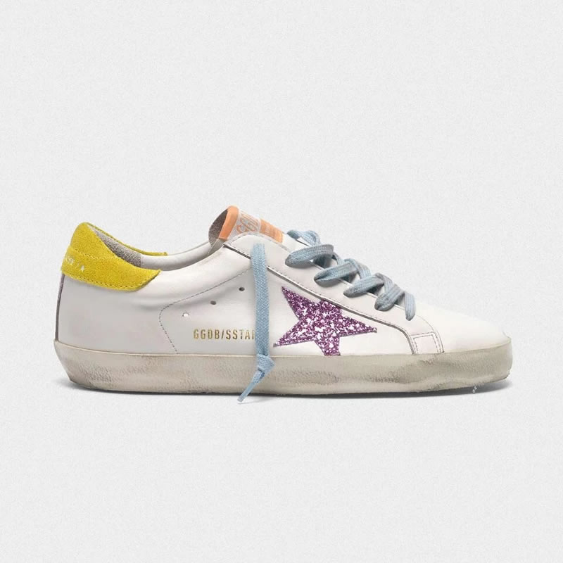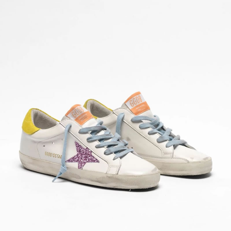 Golden Goose Superstar sneakers with pink glittery star and yellow heel tab